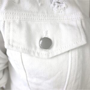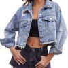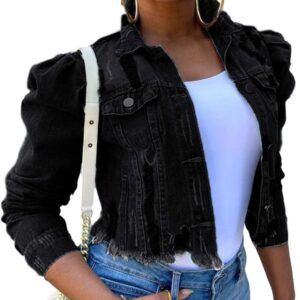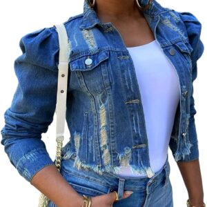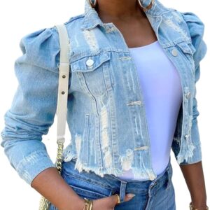 Womens Jean Jacket Long Puff Sleeve Distressed Crop Denim Jackets